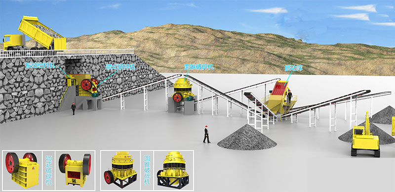 設(shè)備配置:兩臺GZT1256給料機、PE600*900鄂式破碎機、PSGB1600彈簧圓錐破碎機、VSI1150立式?jīng)_擊式破碎機、3YA2460振動篩、4YA2475振動篩以及除塵處理系統(tǒng)、皮帶機、集中控制系統(tǒng)等。